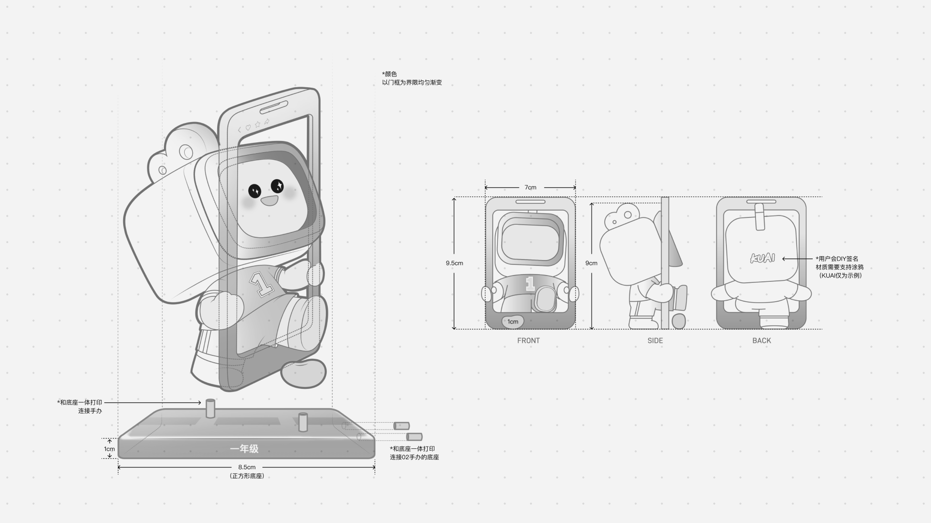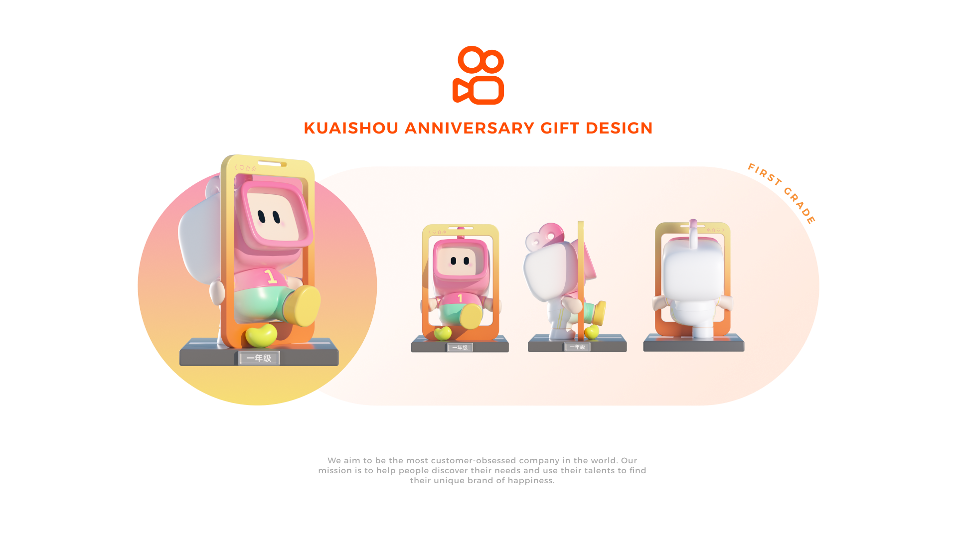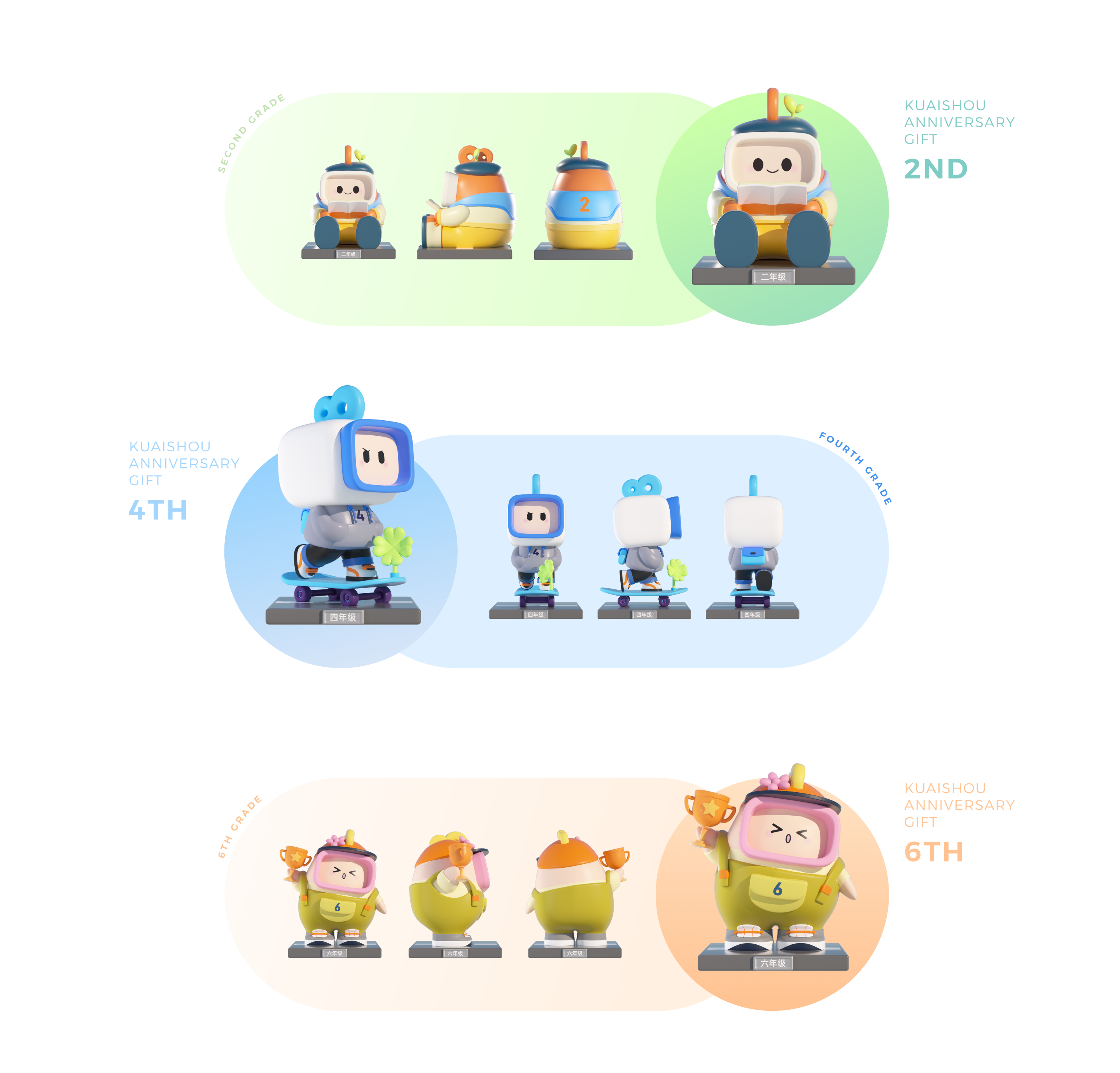 I organized multiple rounds of brainstorming sessions involving the design team, HR colleagues, and marketing & procurement colleagues. Eventually, we decided on the theme "Kuaishou's Journey". A single path connects all anniversary figurines, and the character "Xiao Kuai & Xiao Liu" grows continuously as they move forward on this journey, while the seeds of their ideals gradually bloom and bear fruit.